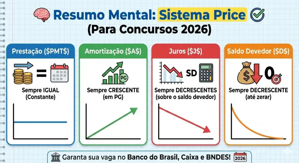 E caso voçê queira gabaritar matemática financeira em 2026? Confira o resumo visual definitivo sobre o Sistema Price para o seu concurso público. Feito sob medida para candidatos do Banco do Brasil, Caixa e BNDES, este mapa mental simplifica tudo o que você precisa para dominar as provas!